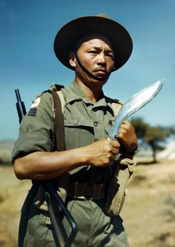 The photo of the Gurkha holding the kukri is Havildar Kul Bahadur Gurung in Burma in WW2; He was in the 23rd Indian Division (formed 1st April 1944), there were three Gurkha battalions in the 23rd, the 3rd/5th, the 3rd/3rd, and 3rd/10th Gurkhas, and the Tora Havildar kukri is based on the one he is holding in the photo.