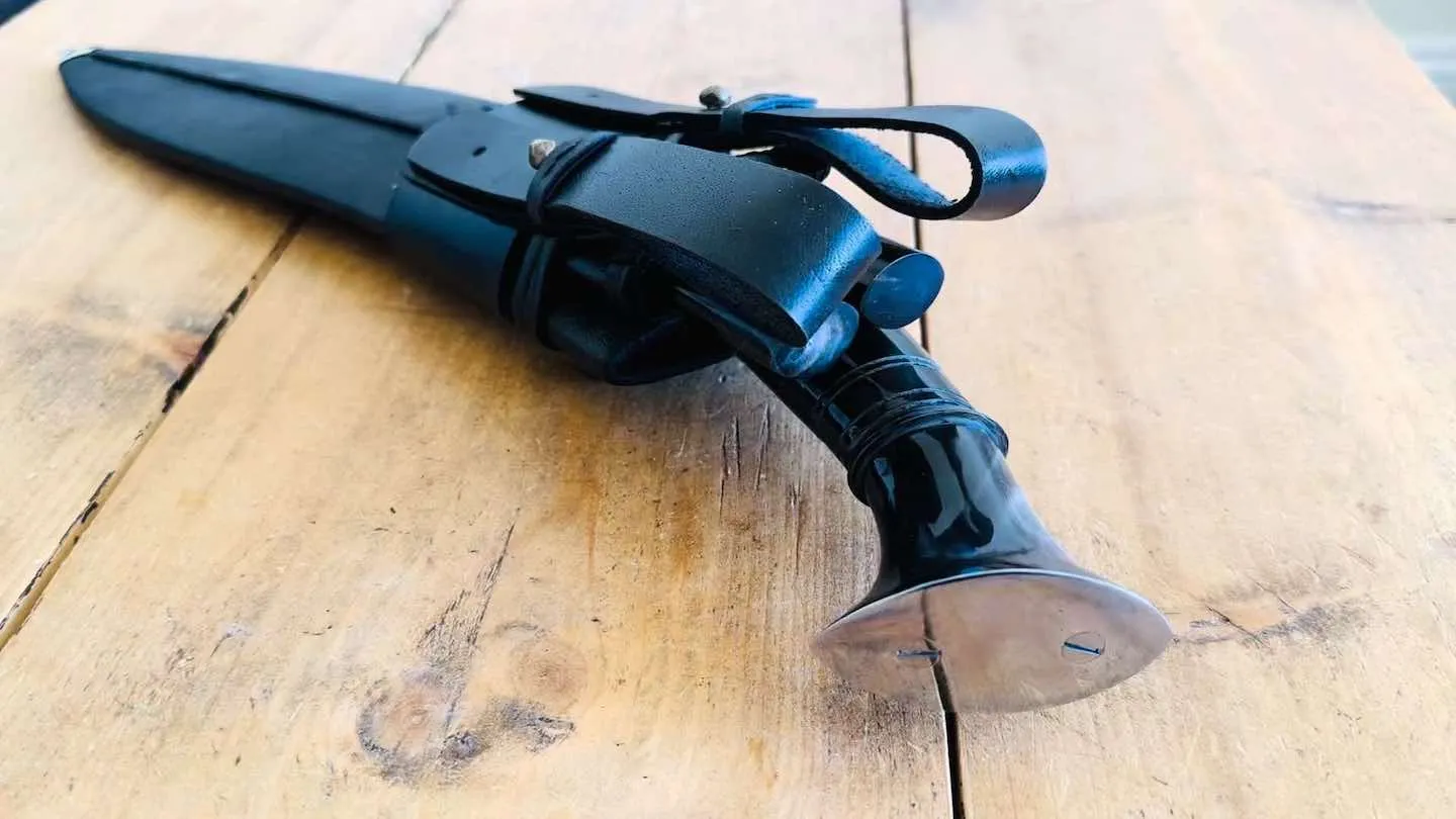 Tora's Premier Tin Chirra is based on a high quality Tin Chirra kukri. It comes with a Triple fullered (Tin Chirra) blade which is 34cm long and has a stick tang Premier horn handle with WW1 designed butt cap.